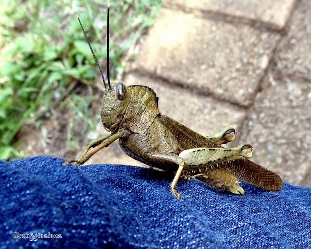 This large Grasshopper hitched a ride by clinging to the back of my leg.